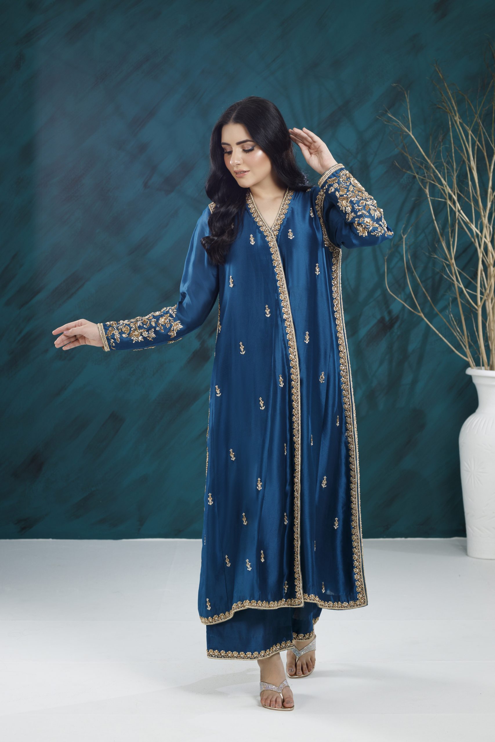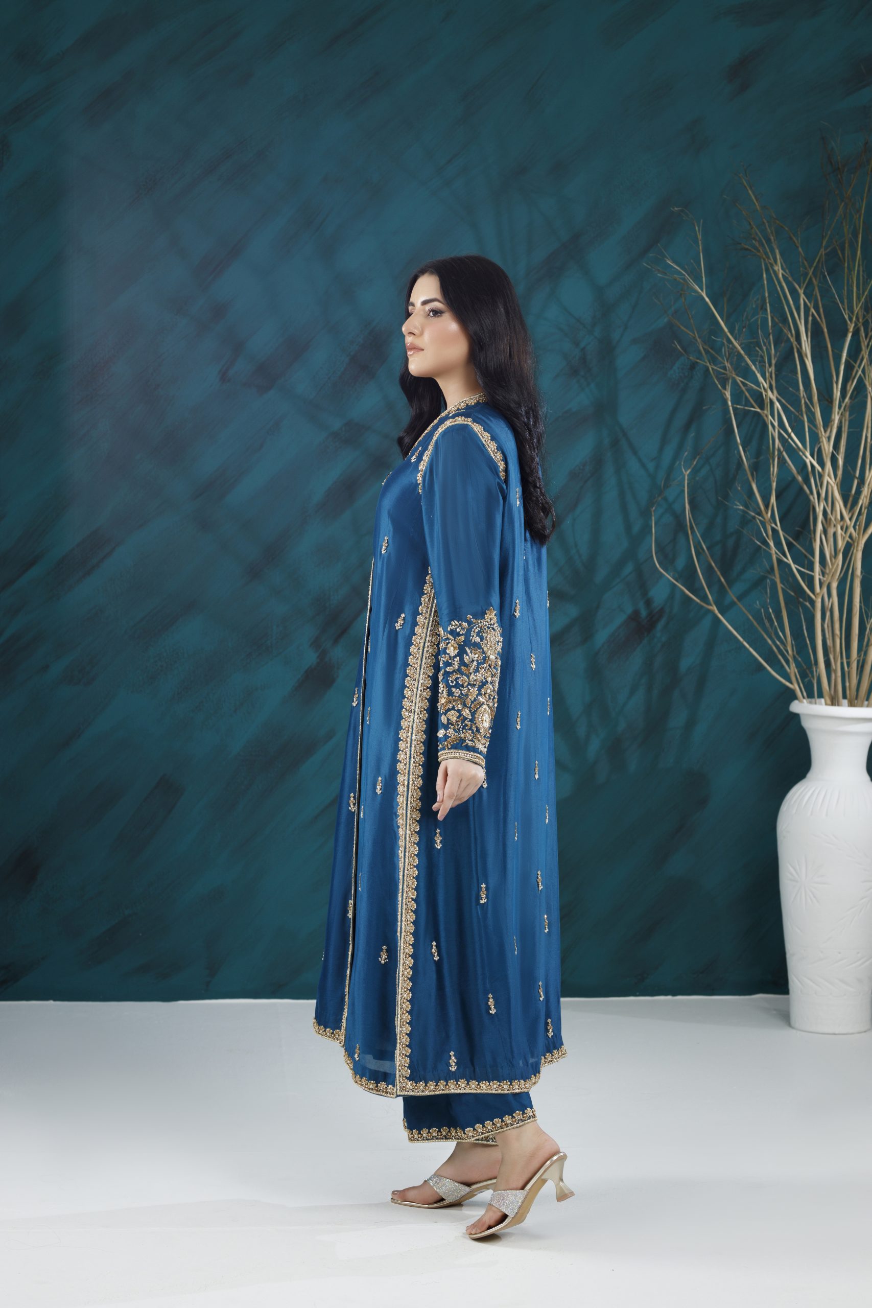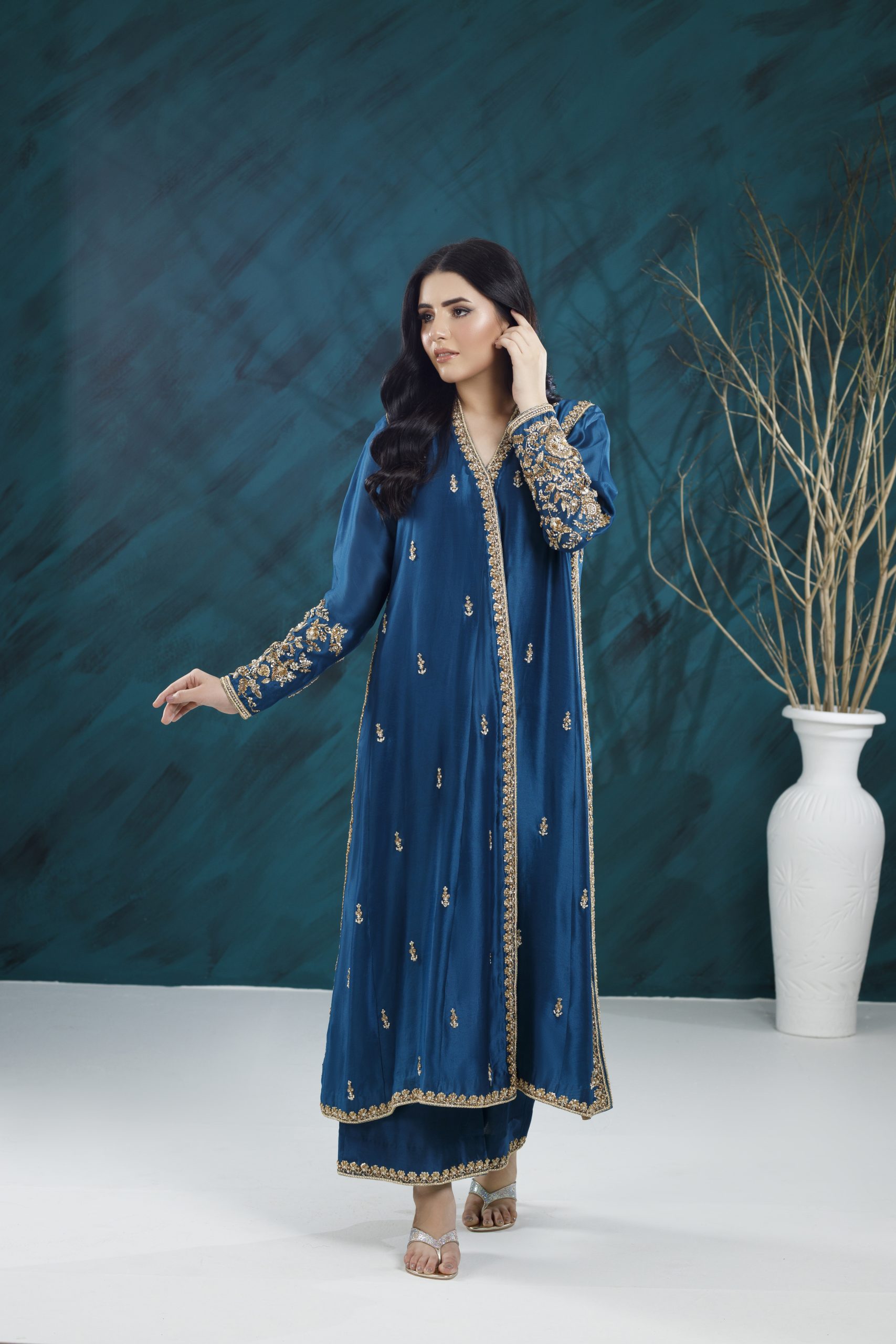 A refined formal ensemble featuring rich textures, elegant embellishments, and a flattering silhouette — perfect for weddings, festive gatherings, and special occasions.