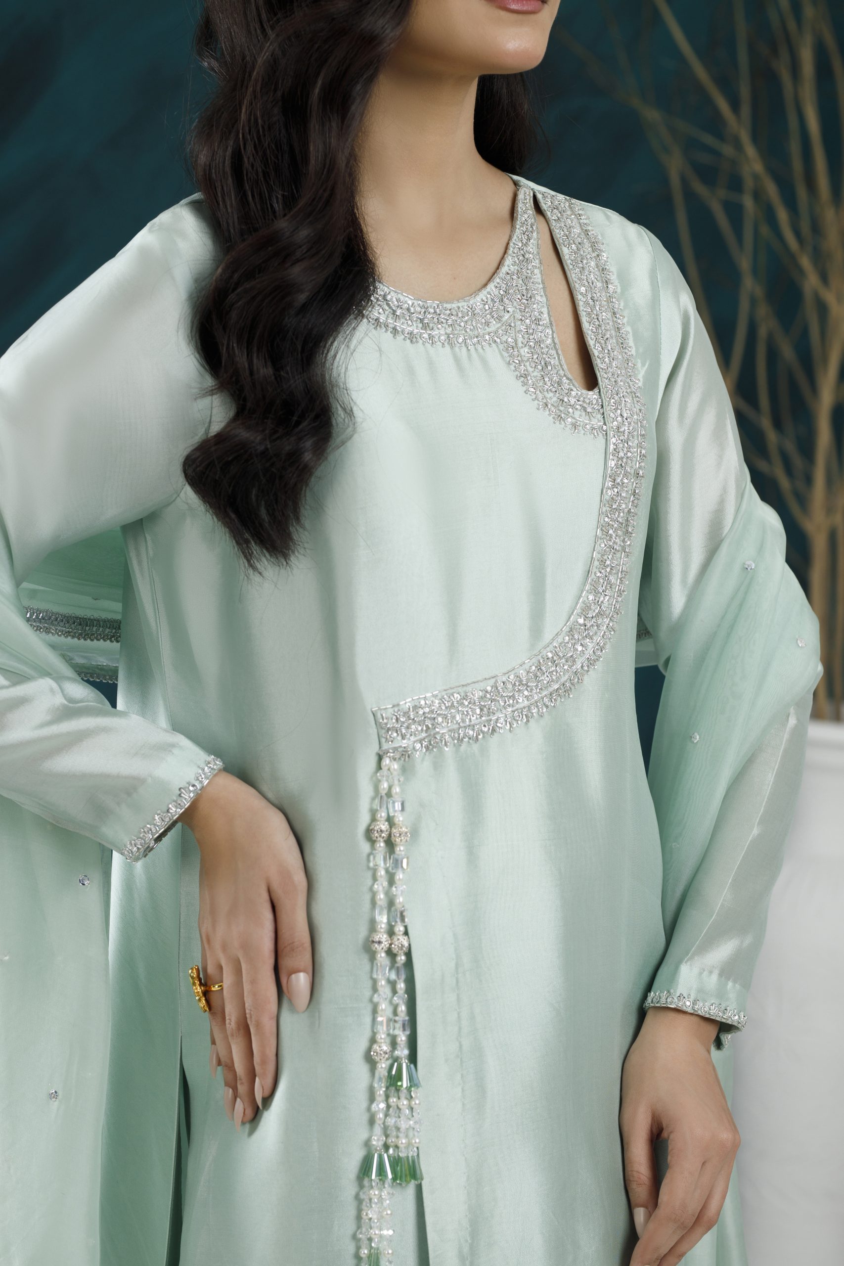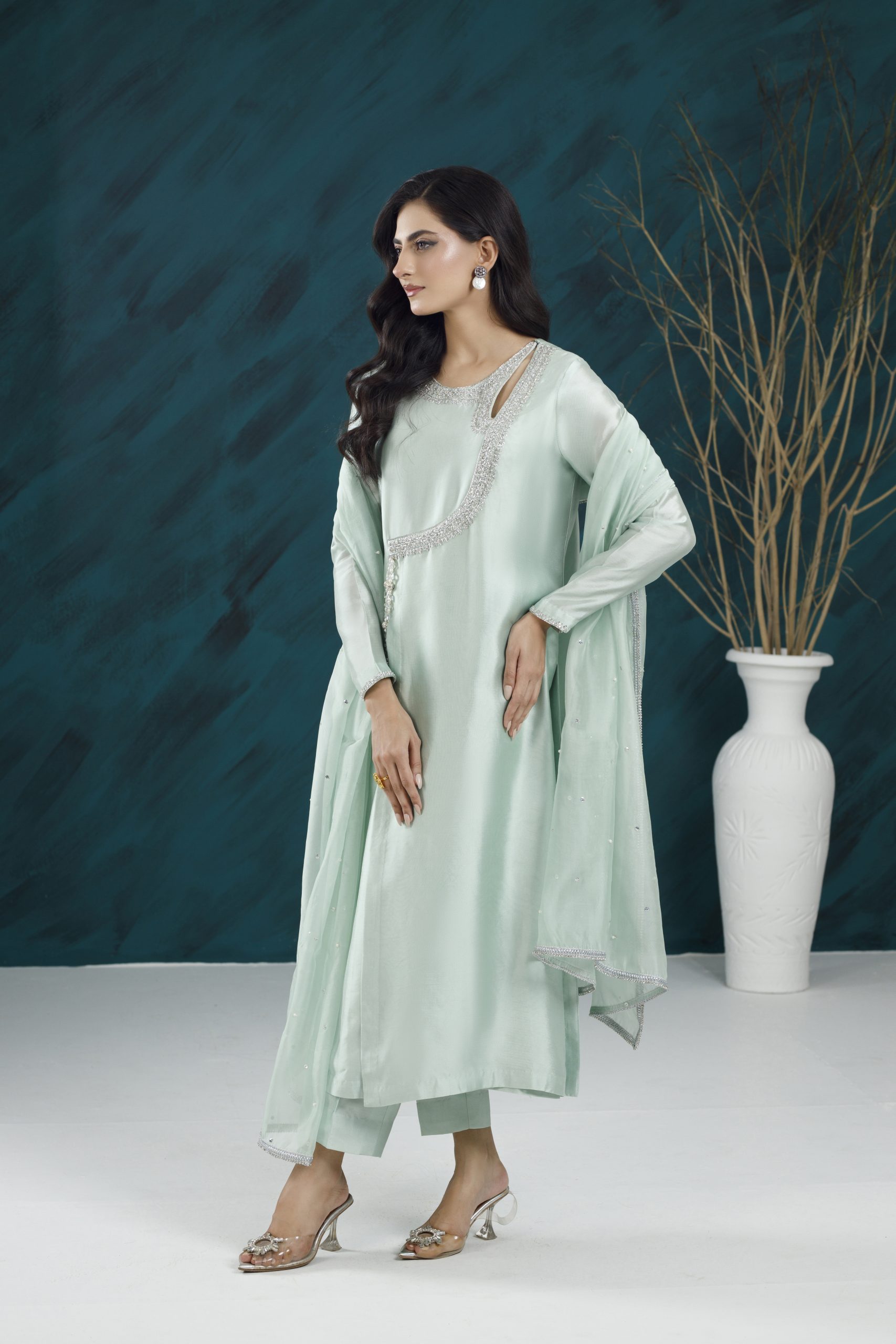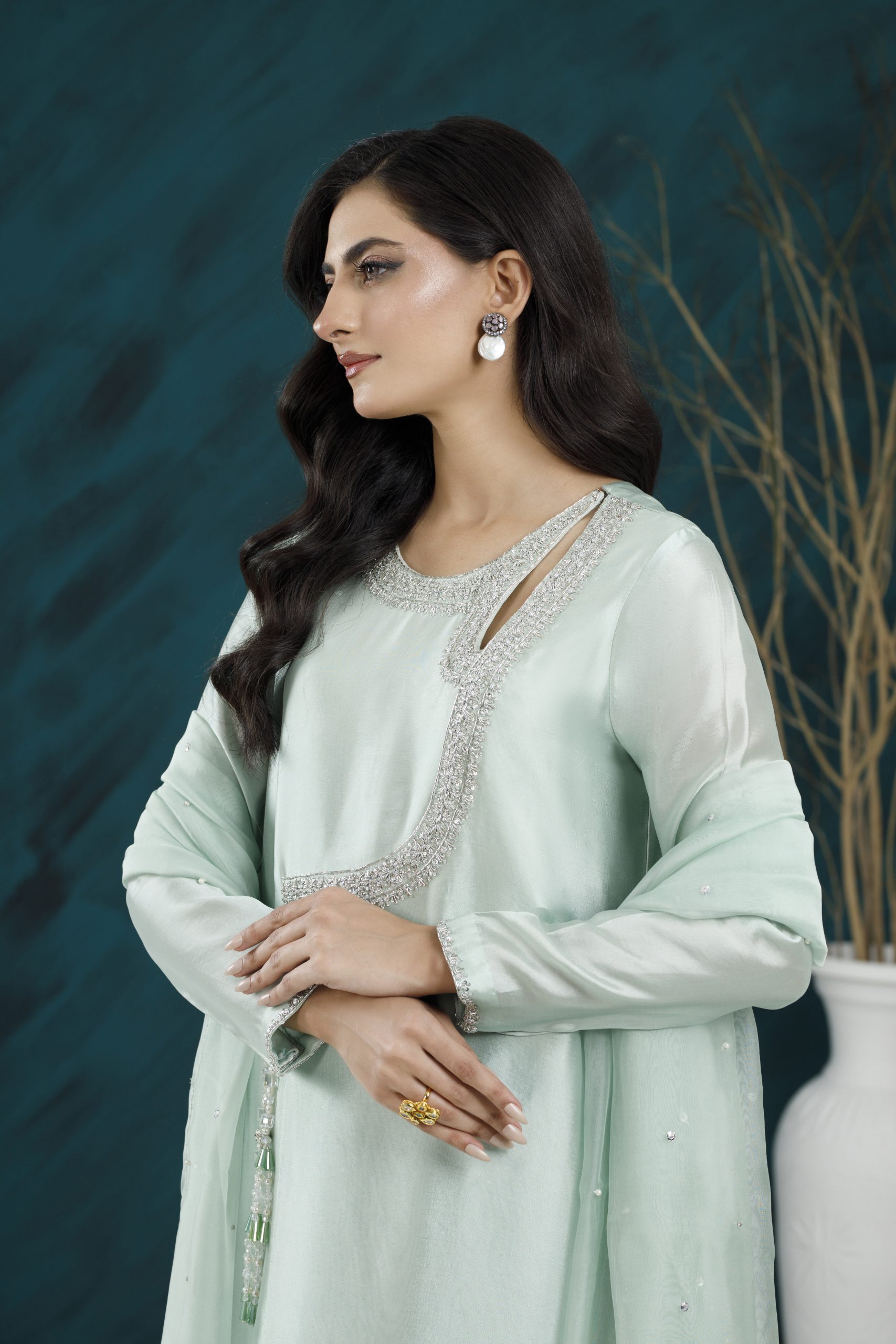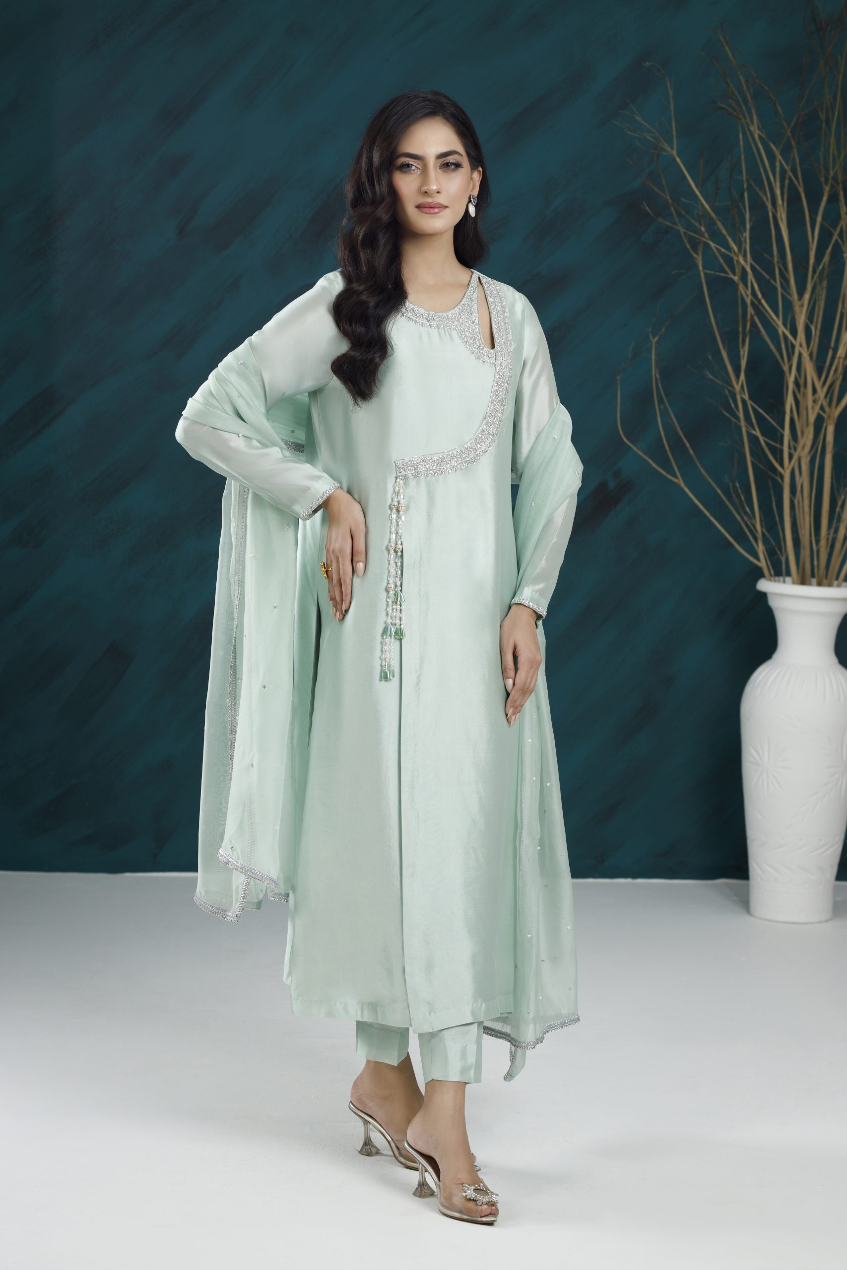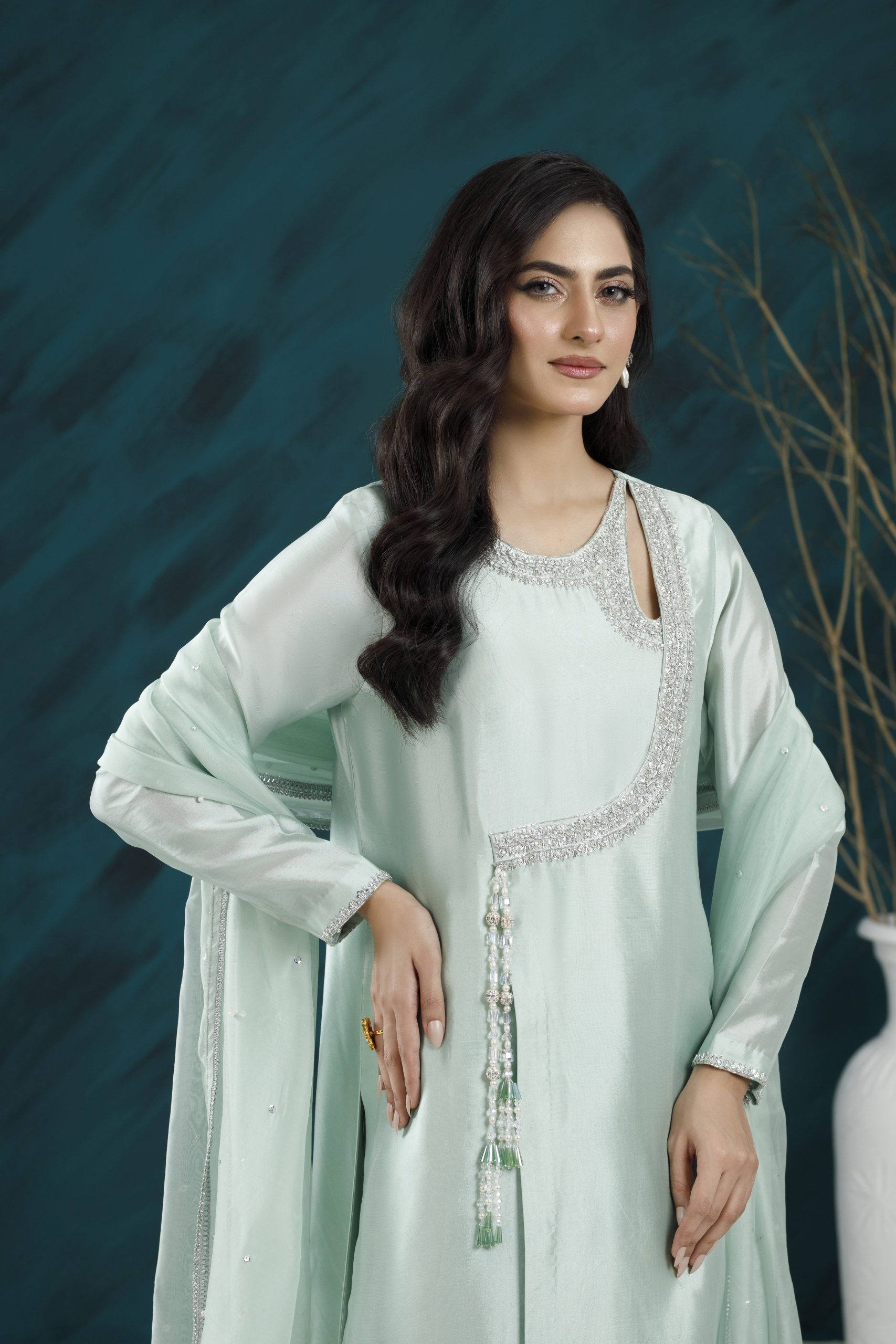 A refined formal ensemble featuring rich textures, elegant embellishments, and a flattering silhouette — perfect for weddings, festive gatherings, and special occasions.